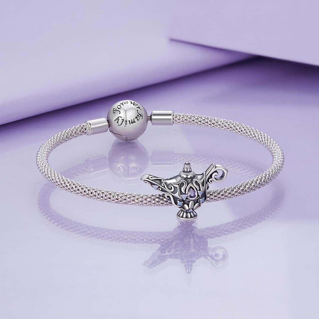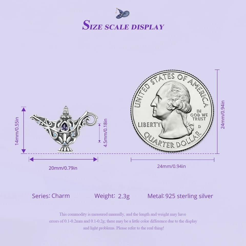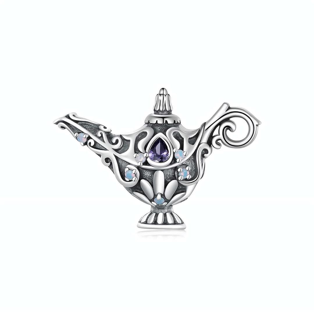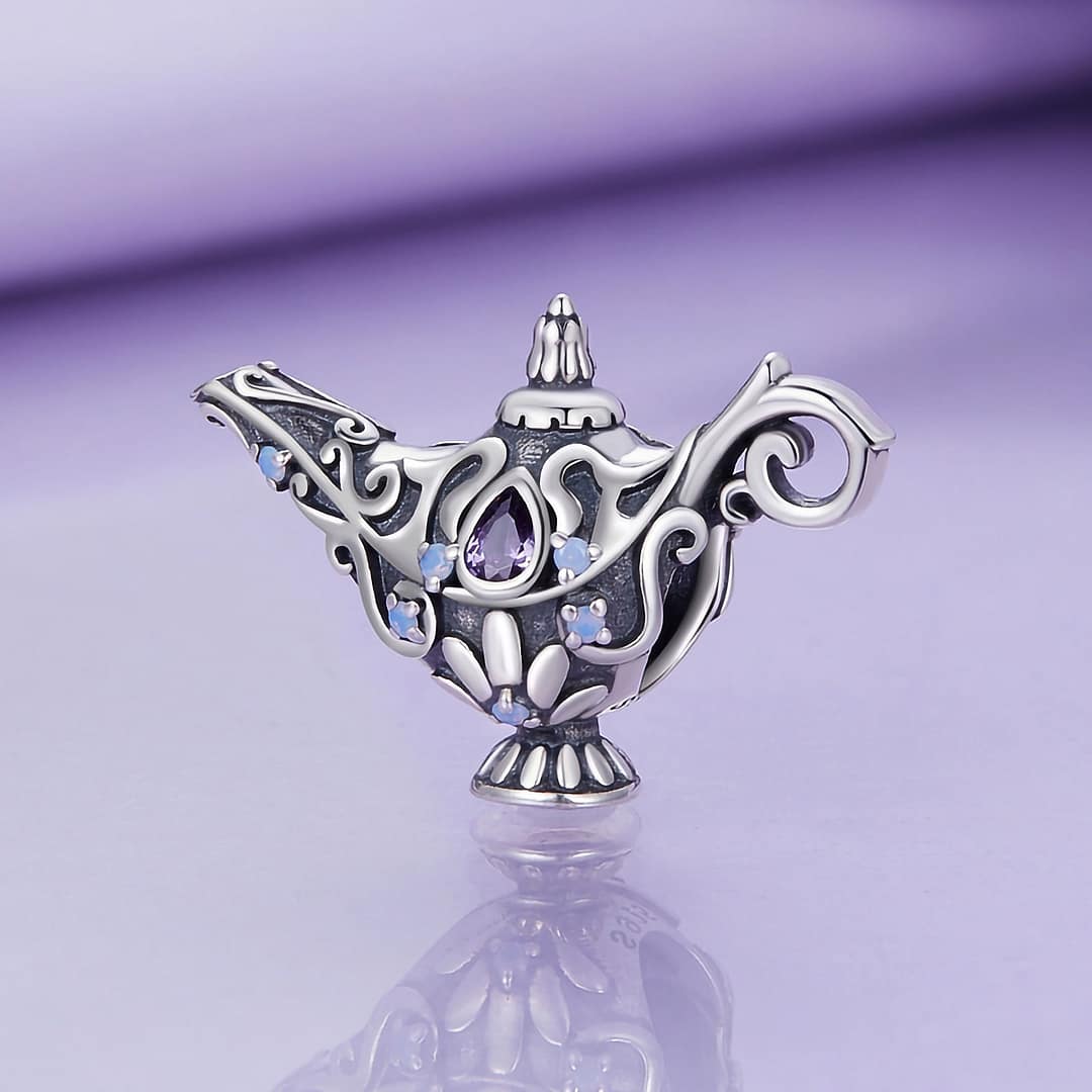Adorned with intricate details, including opal stones and purple cubic zirconia, this charm exudes an aura of magic and fantasy. The lamp symbolizes wish fulfillment, offering a reminder that dreams can come true with a touch of whimsy and belief.