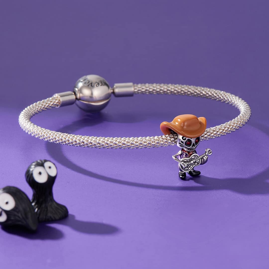 Let your bracelet strike a spirited chord with the Cowboy Skeleton Guitarist Charm, a lively, symbolic piece from the Coco Charms Collection. Designed to capture the heart of music, memory, and cultural artistry, this charm pays homage to the bold energy of a cowboy musician and the timeless beauty of sugar-skull tradition.