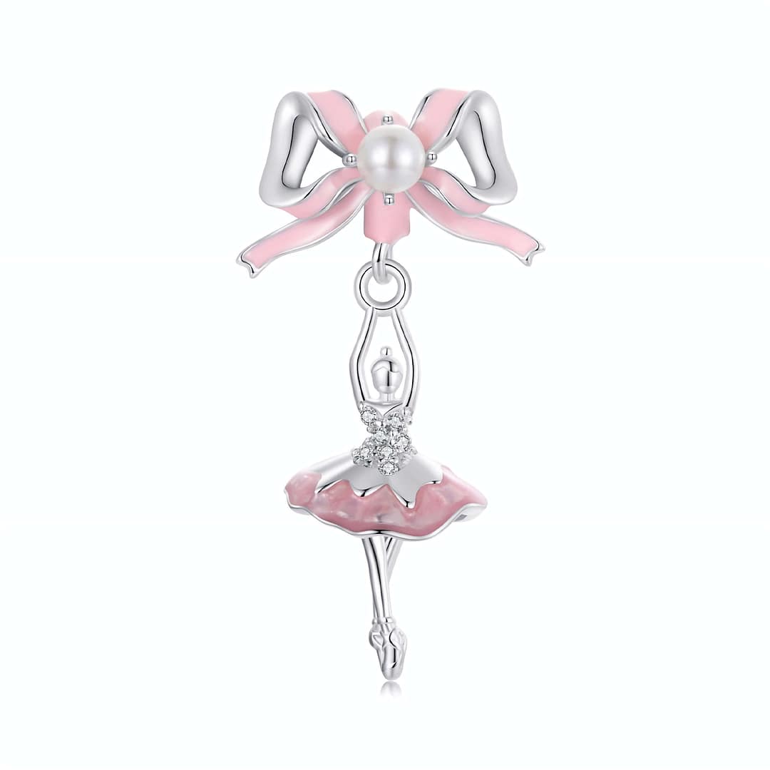Adorning the charm is a delicate ballerina dancer, her dress intricately designed with pink enamel and sparkling cubic zirconia stones, radiating beauty and sophistication. The charm’s bail takes the form of a graceful pink ribbon bow, embellished with a lustrous white pearl, adding a touch of enchantment to the piece.