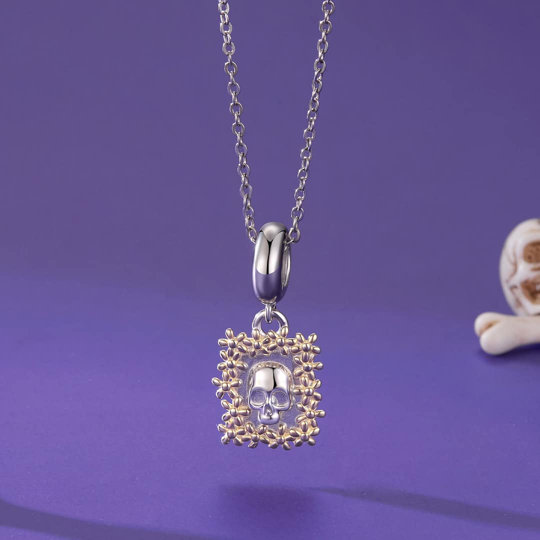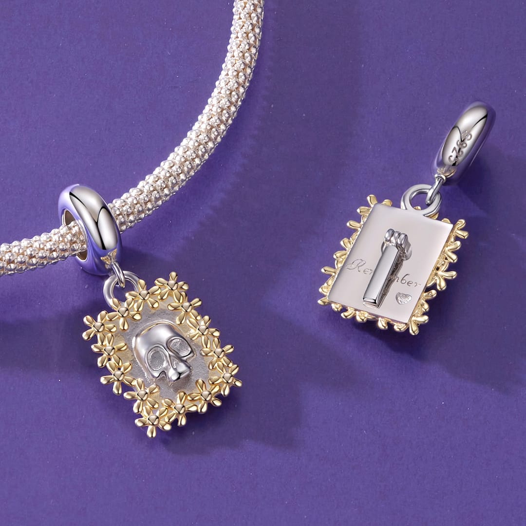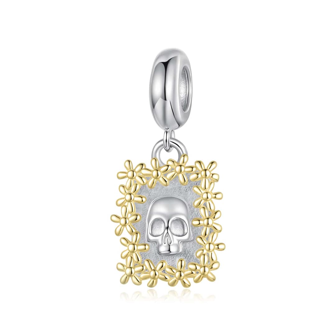 Step into a world where artistry meets emotion with the Golden Floral Skull Frame Charm, a standout piece in our Coco Charms Collection. Crafted from high-quality S925 sterling silver, this dangle charm features a beautifully sculpted skull framed by delicate gold-plated flowers.