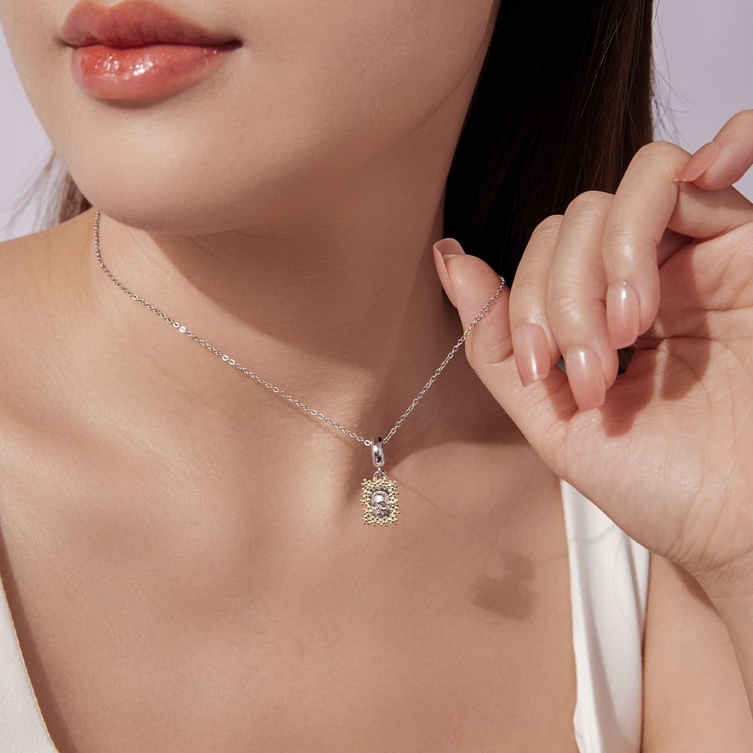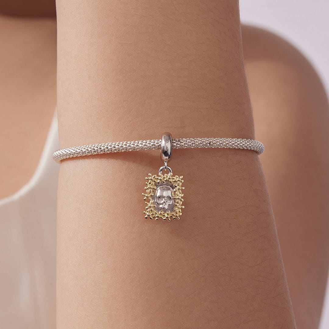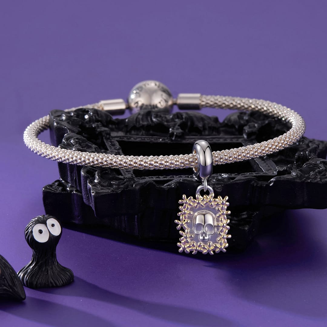 Step into a world where artistry meets emotion with the Golden Floral Skull Frame Charm, a standout piece in our Coco Charms Collection. Crafted from high-quality S925 sterling silver, this dangle charm features a beautifully sculpted skull framed by delicate gold-plated flowers.